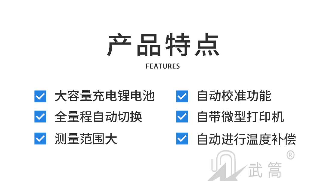 量程自動切換功能、 鹽密測量范圍大、自動進行溫度補償、儲存和打印功能、大容量充電鋰電池、自動帶電修正系數(shù)等。