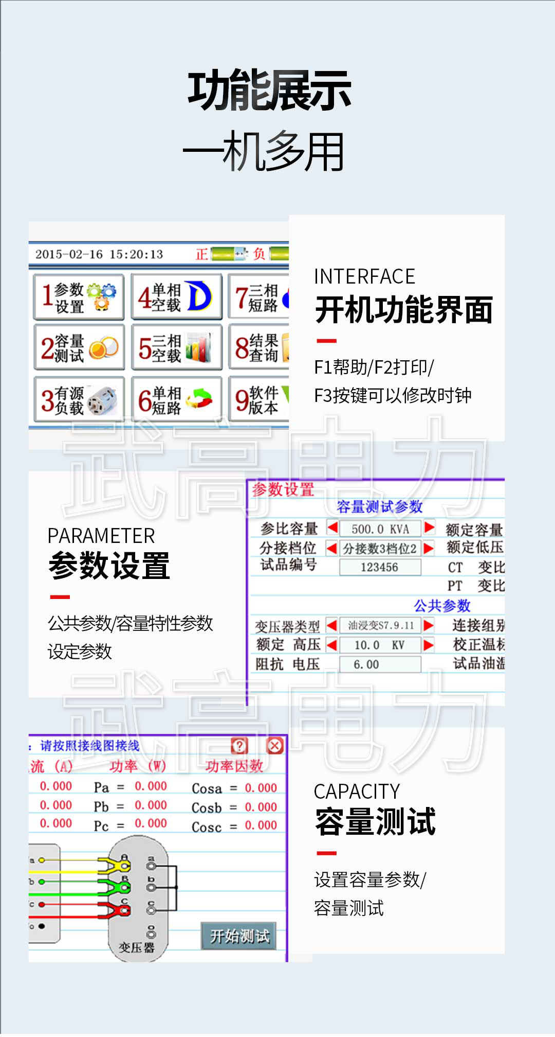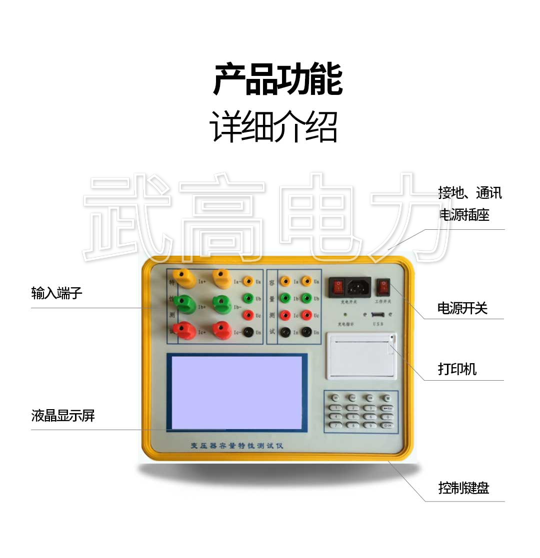 測(cè)量變壓器的容量、負(fù)載損耗、空載損耗、阻抗電壓、空載電流等工頻參數(shù)。